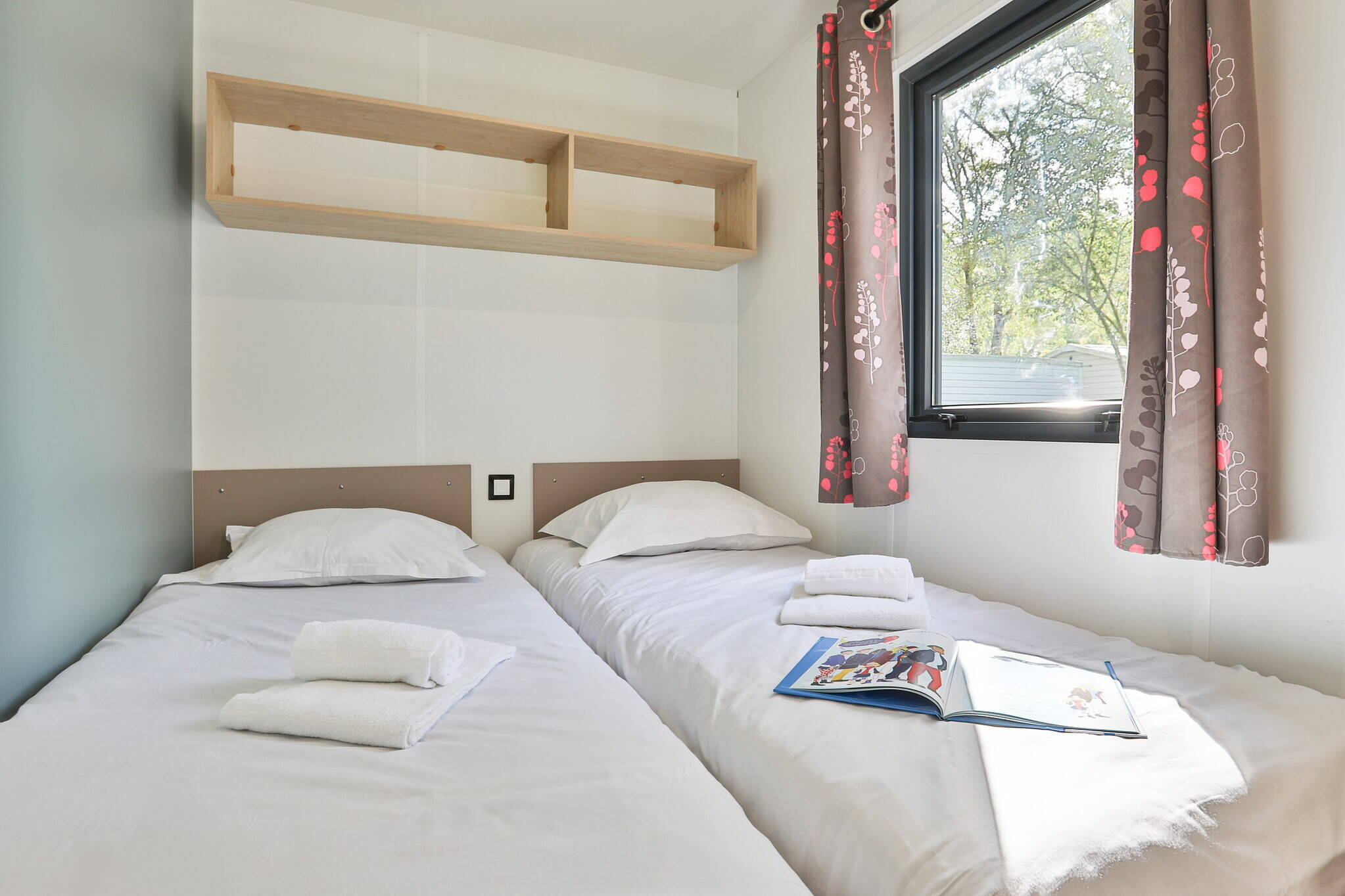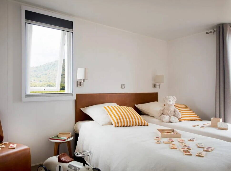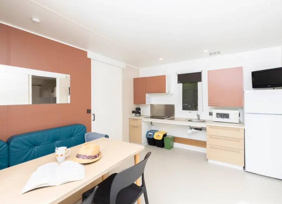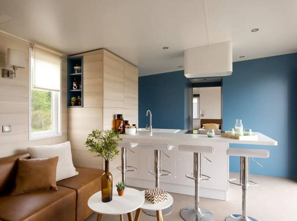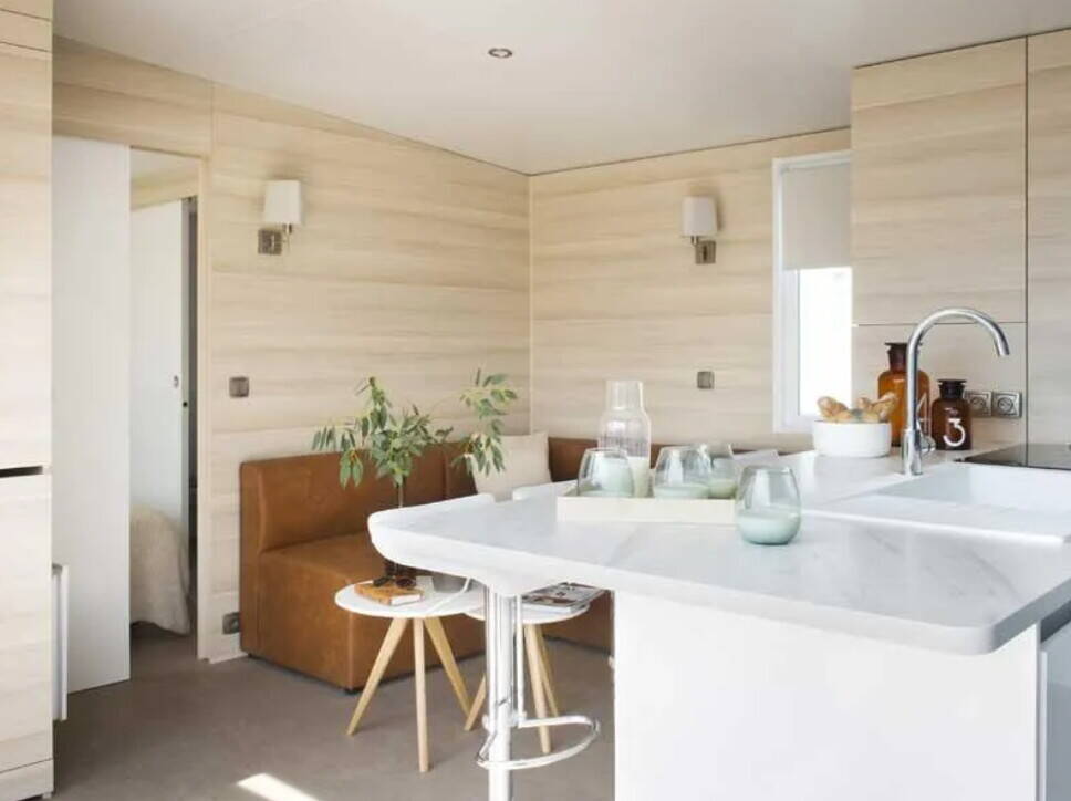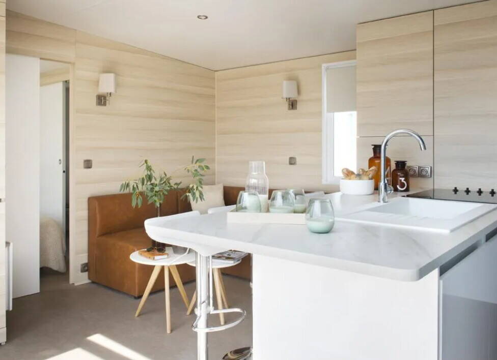 - Luxus-Camping: Mobilheim mit großflächigen Zimmern und luxuriösen Möbeln ist vorhanden