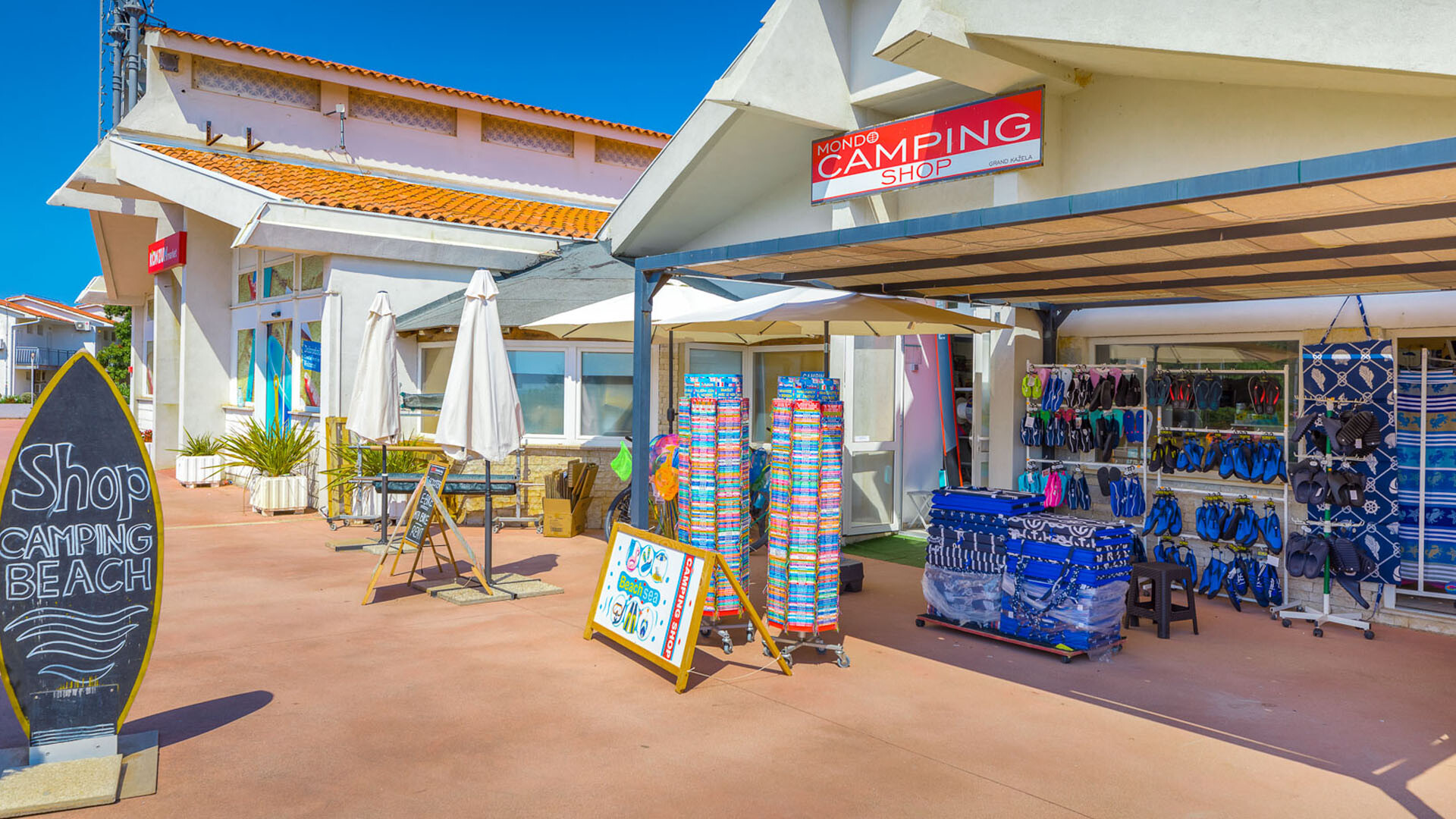 Mit 6 Fußballfeldern können Sie dem liebsten Sport der Deutschen frönen. Daneben sind mit Tennis, Tischtennis, Hand-, Basket-, Volley- und Beachvolleyball die wichtigsten Ballsportarten abgedeckt. Eine Partie Minigolf gibt Abwechslung vom glasklaren Wasser an dem steinigen, manchmal auch felsigen Kiesstrand. Ihr Campingurlaub ist auf Grand Kazela ein Aktivurlaub. Wassersport wird großgeschrieben, selbst Segeln können Sie in der Segelschule versuchen. Machen Sie einen Tauchgang oder erleben Sie die anderen Angebote des Mediterraneo-Beach-Sportcenters.