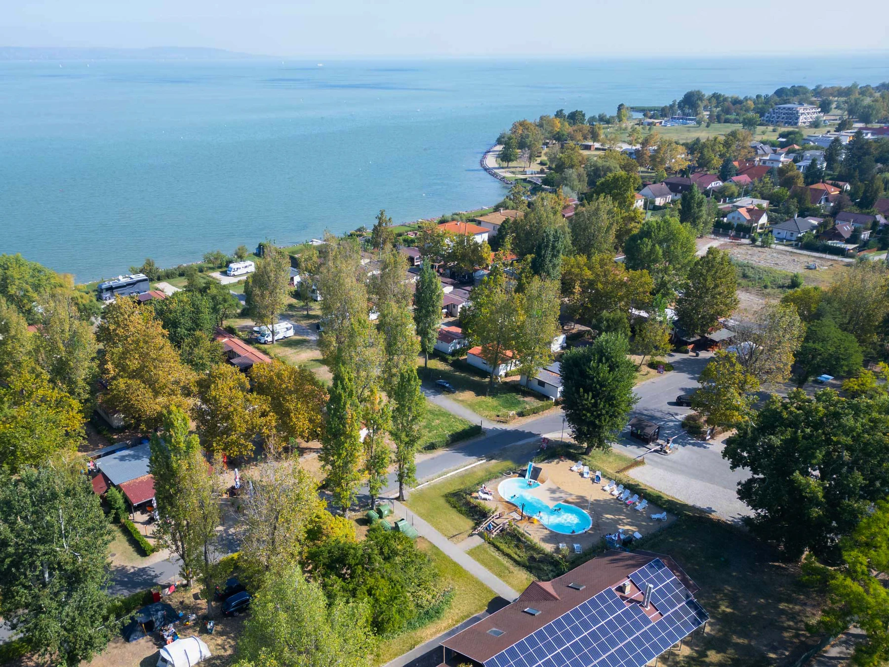 Der Plattensee ist bei Familien mit kleinen Kindern sehr beliebt, da das Ufer ganz seicht ins Wasser abfällt. Das große Highlight des 3-Sterne-Campings Mirabella ist der Privatstrand mit Surfschule und Wassersportgeräteverleih. Auf dem Gelände des Campingplatzes gibt es auch einen einen beheizten Außenpool.